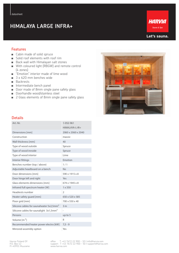 The Harvia Himalaya Hybrid Salt Sauna Cabin delivers a refined multi-therapy wellness experience, combining traditional electric sauna heat with full-spectrum infrared warmth and Himalayan salt therapy - the combination of heat and salt activates the hygroscopic properties of the salt releasing valuable minerals into the air enhancing not only your breathing and skin health but also your overall well being.
