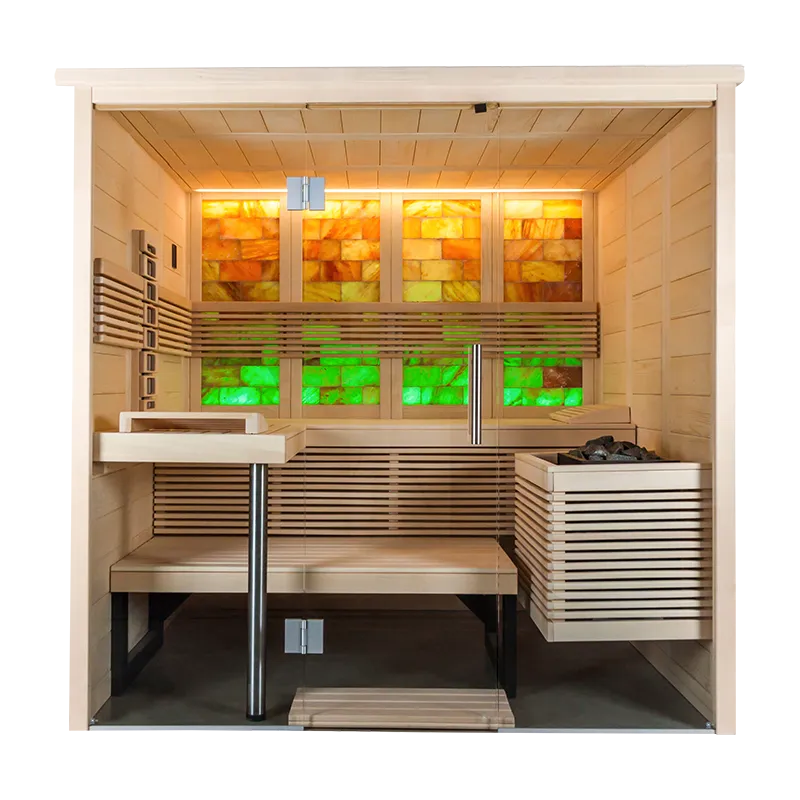 The Harvia Himalaya Hybrid Salt Sauna Cabin combines traditional Finnish sauna performance, full-spectrum infrared therapy, and Himalayan salt therapy in one luxury design!