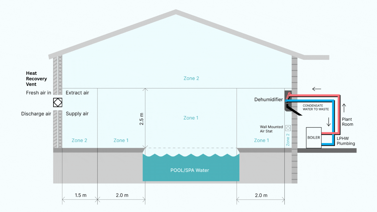 Introducing controlled fresh air through a heat recovery unit helps reduce chloramines - chemical by-products of chlorine and ammonia from bathers. Trichloramine, in particular, causes the familiar "chlorine smell" and may irritate skin, eyes, and the respiratory system. In domestic pools with proper sanitisation and showering routines, chloramine levels are typically low, but adequate ventilation remains crucial.
